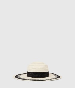 Un chapeau de soleil à bord large offrant une sensation de tissage tactile et des bandes contrastées qui encadrent le visage. Un ajustement réglable et un logo brodé signature lui ajoutent une élégance raffinée et ensoleillée.