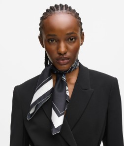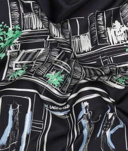Une écharpe carrée en soie ornée de l'illustration Maison de Karl et d'une bordure avec logo contrastante, alliant un esprit artistique à un style raffiné dans un accessoire polyvalent.