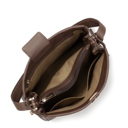 Ce grand sac hobo est confectionné de cuir de vachette pleine fleur. Il possède une séparation intérieure zippée, une poche zippée et une double poche simple ainsi qu'une poche arrière extérieure zippée. Il se porte à l'épaule ou croisé.