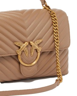 Classic Love Bag Puff en cuir nappa matelassé en chevrons. La fermeture arbore l’emblématique boucle Love Birds Diamond Cut en métal. L’intérieur présente une doublure en daim microfibre, un compartiment zippé et une poche plaquée. La bandoulière associe la chaîne ronde en métal classique à une pratique patte d’épaule ajustable en cuir nappa.