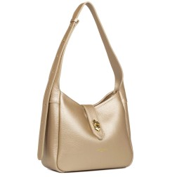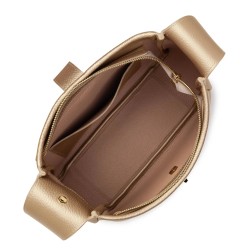 Ce petit sac seau est confectionné de cuir de vachette grainé. Il comporte une grande poche principale et une porte arrière extérieure zippée. Il se porte à l'épaule ou croisé.