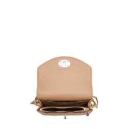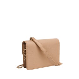 Le modèle Faustine incarne la quintessence du chic minimaliste au sein de la Maison Mac Douglas. Cette petite pochette à rabat se distingue par sa matière au grain délicat, offrant une texture d'une grande finesse au toucher. Son design est magnifié par une bandoulière en chaîne dorée entrelacée de synthétique uni, véritable détail joaillier qui transforme ce sac en un accessoire précieux. En son centre, le fermoir rotatif ovale doré, signature emblématique de la marque, vient sceller le rabat avec une sophistication absolue, capturant la lumière à chaque mouvement.