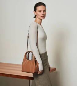 Ce petit sac à main souple, en cuir lisse et aux lignes sans découpe, arbore un charms T finition doré clair signature de la Maison. Il se porte à la main, à l'épaule ou croisé avec sa bandoulière amovible.